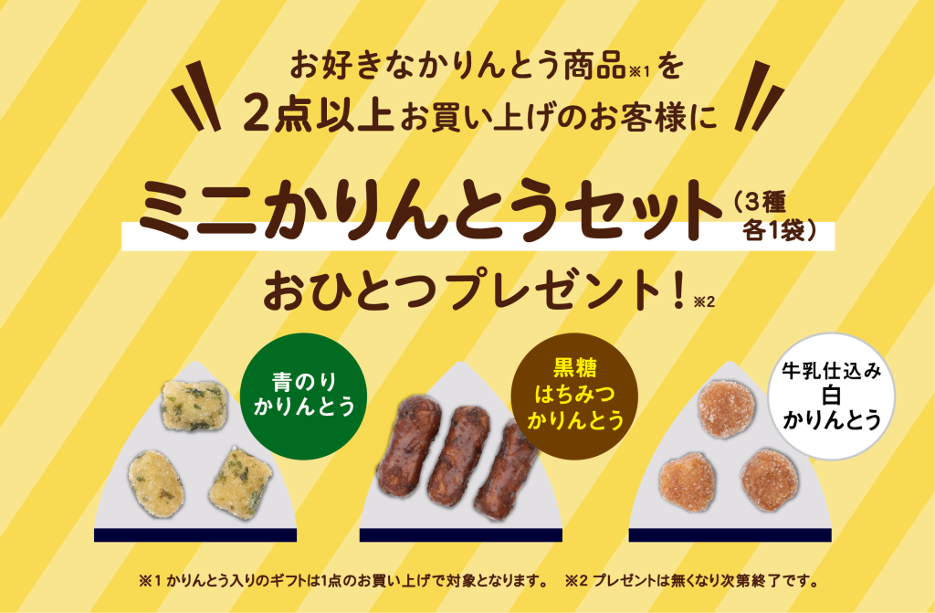 期間中、お好きなかりんとう商品を2点以上お買い上げいただいた方に「ミニかりんとうセット(3種各1袋)」をおひとつプレゼント!