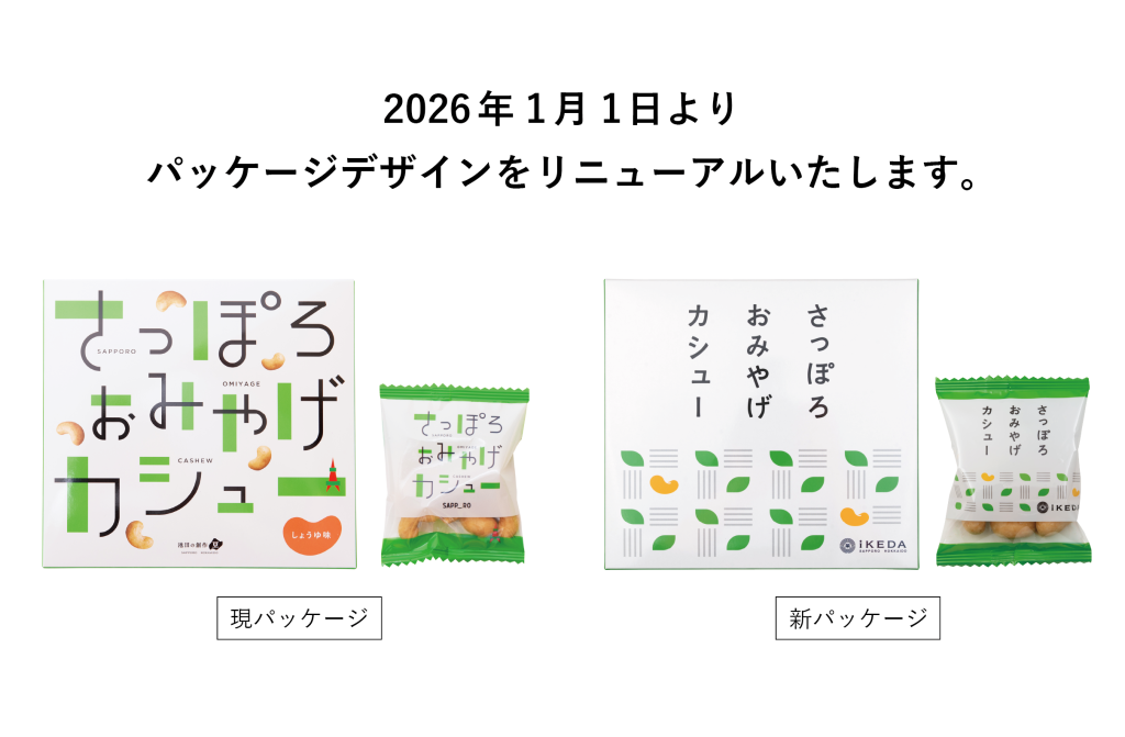 2026年1月1日(木)より、「さっぽろおみやげカシュー」のパッケージをリニューアルいたします。