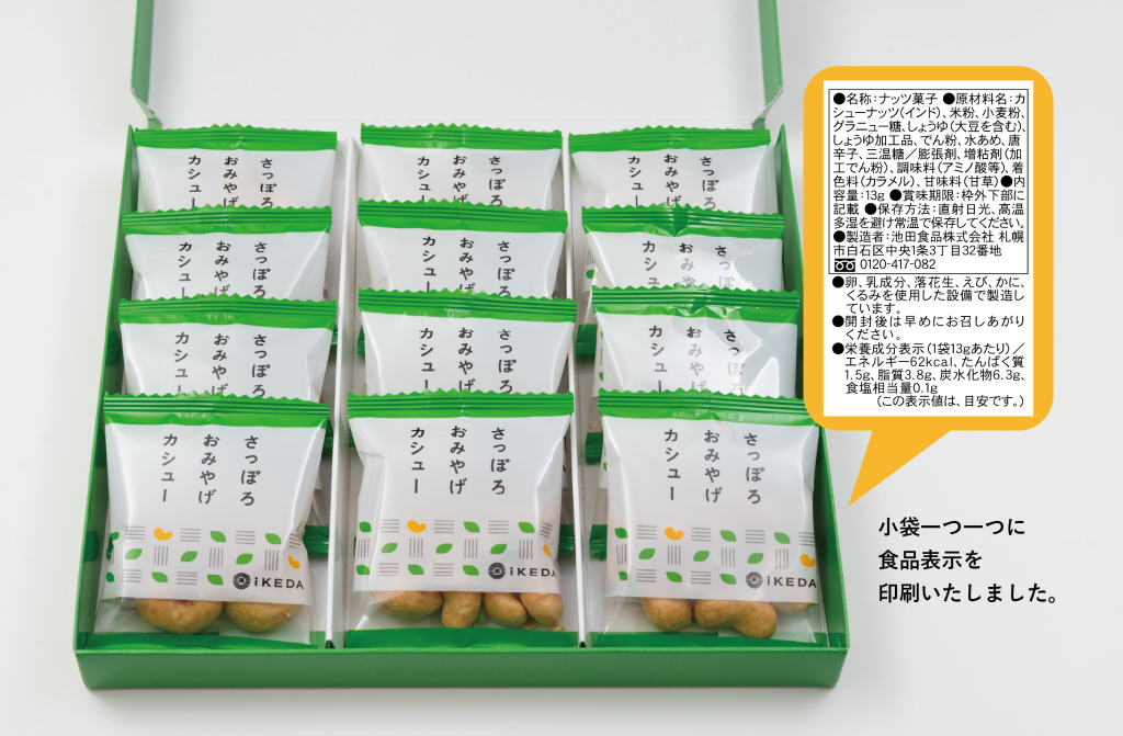 また、お客様からのご要望を受けて小袋一つ一つに食品表示と賞味期限を印刷しました。