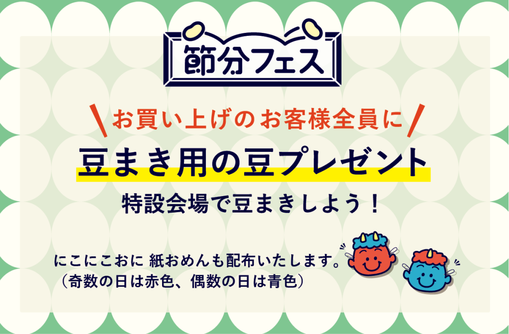 お買い上げのお客様全員に【豆まき用の豆】をプレゼント。特設会場にて鬼に扮した社員と一緒に豆まきをお楽しみください!